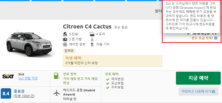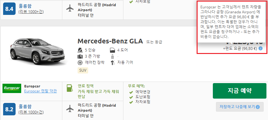 또가남은 마드리드에서 렌트해 그라나다에 반납할 예정이라 다른 지점에서 차량 반환하기를 누르면 반납할 지점을 따로 설정할 수 있습니다.