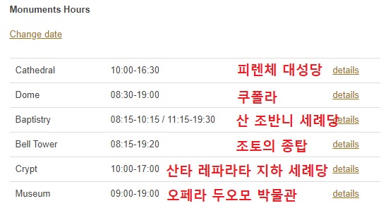피렌체 두오모 통합권으로 갈 수 있는 곳들의 입장가능 시간입니다. 예약할 시에 휴관일 등을 고려하여 예약하기를 권장하고 있습니다. 휴관일 등을 확인하기 위해서는 우측의 details 버튼을 누르시면 됩니다.