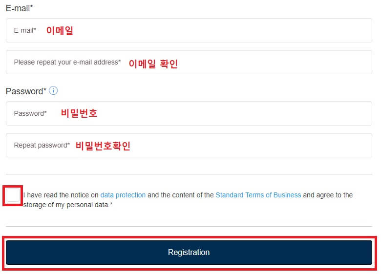 이메일, 비밀번호, 동의에 체크, Registration까지 누르시면 회원가입 완료입니다.