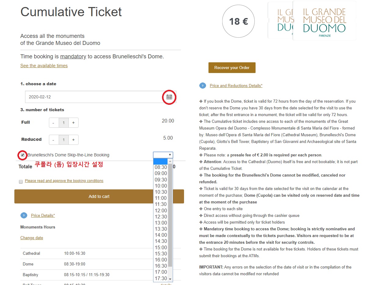 가장 먼저, 가시는 날짜와 인원을 설정합니다. 일반 성인은 Full, 아동은 Reduced 입니다. 그리고 그 아래 쿠폴라 입장시간을 체크하시고 설정하시면 됩니다. 쿠폴라는 예약한 시간 20분 전에는 입구에 오라고 되어있습니다.