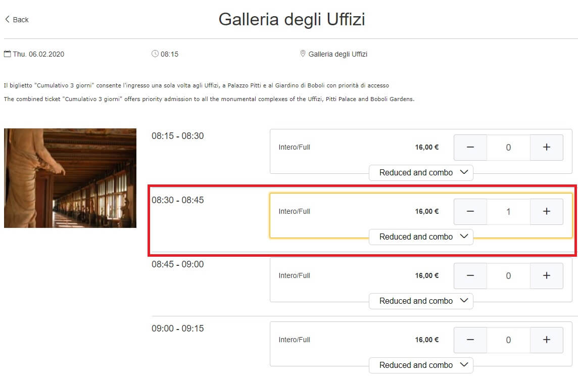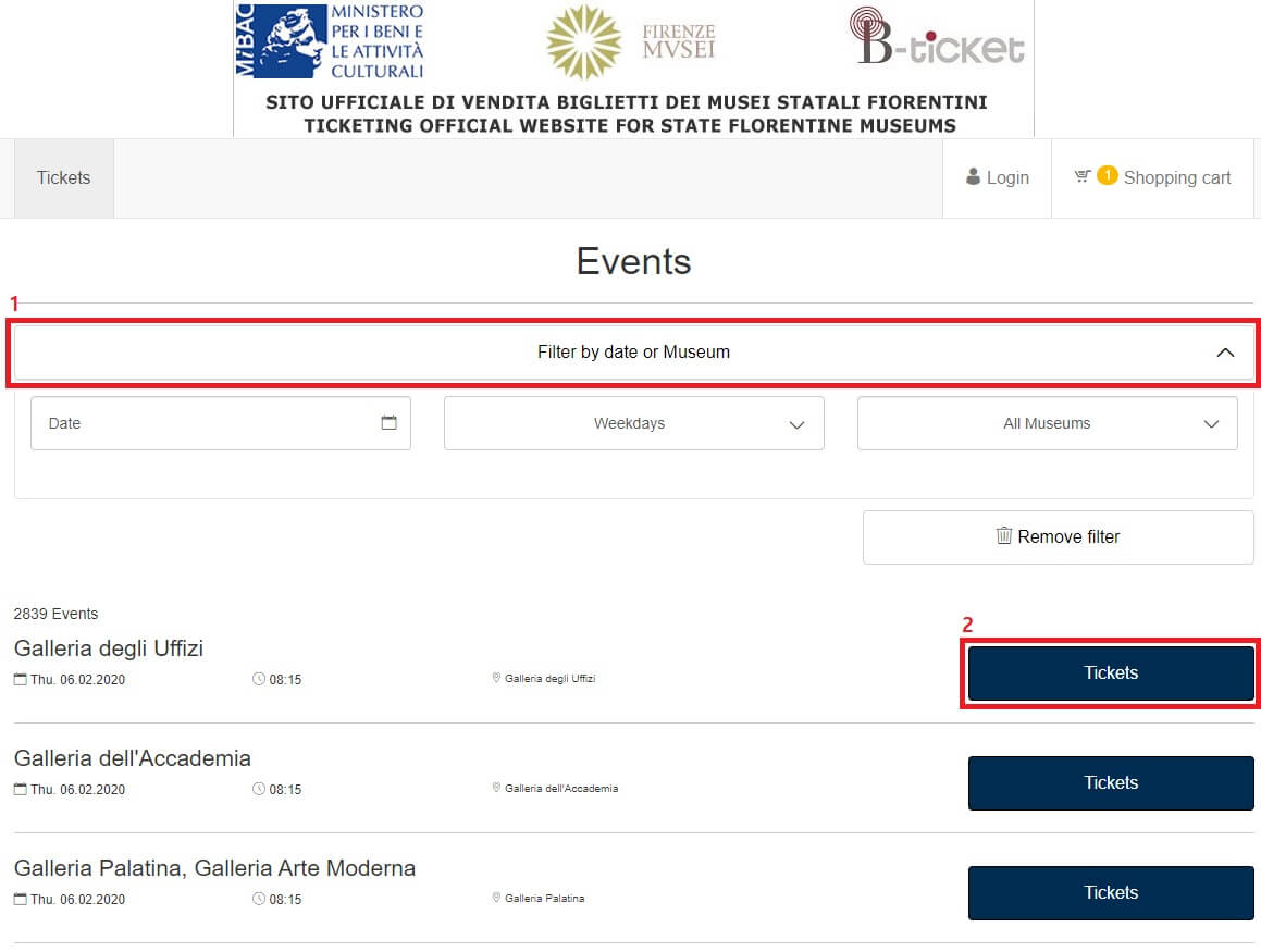 제일 먼저, 1번을 누르셔서 가실 날짜를 설정하신 후, 가장 위에있는 2번 Galleria degli Uffizi의 Tickets을 누르시면 됩니다.