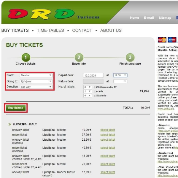링크에 접속해 출발지 Mestre, 도착지 Ljubljana, 편도로 설정하신 후 날짜와 원하는 시간, 인원을 선택합니다. 모두 선택하셨으면 틀린 것은 없나 확인해 보시고 Buy tickets.