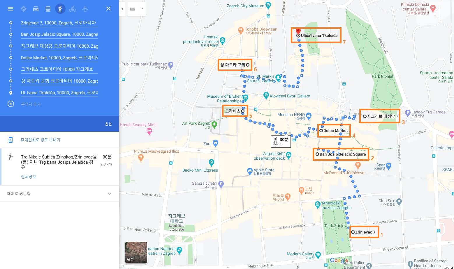 즈리네바츠 공원 - 반 옐라치치 광장 - 자그레브 대성당 - 돌라체 시장 - 그라데츠 - 성 마르카 교회 - 트칼치차거리로 이어지는 루트입니다.
