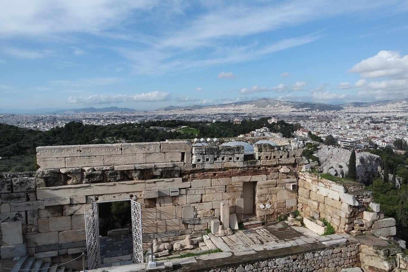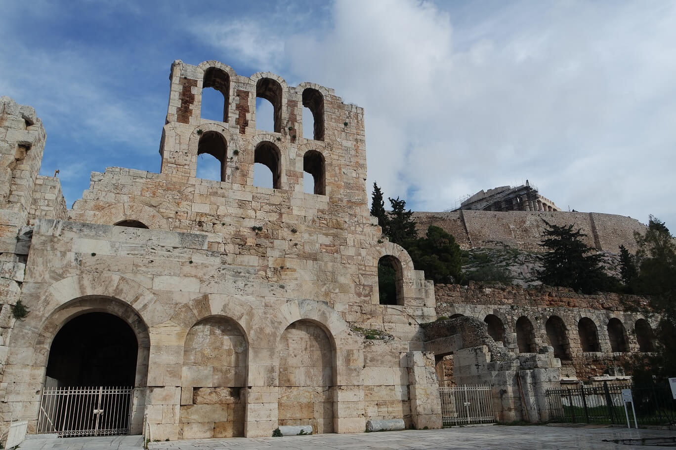아크로폴리스는 아테네 여행의 핵심답게 입구부터 상당히 다양한 볼거리를 제공합니다. 아치형 문으로 둘러싸인 유적은 바로 아래 소개드릴 헤로데스 아티쿠스 극장의 앞쪽 벽면입니다.