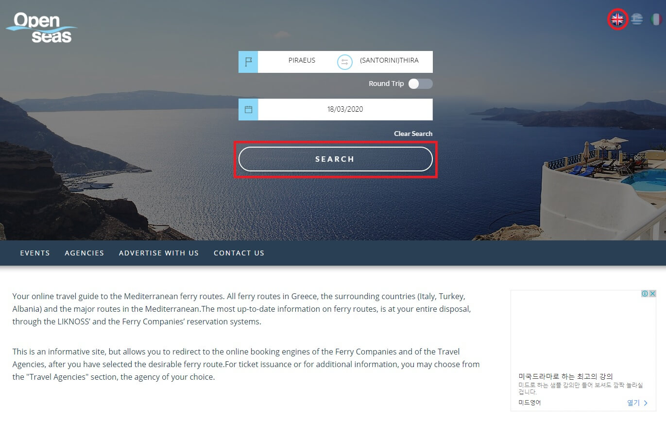 귀찮지만 다시 한번 출발지(PIRAEUS)와 도착지(THIRA), 날짜를 설정하시고 SEARCH버튼을 누릅니다.