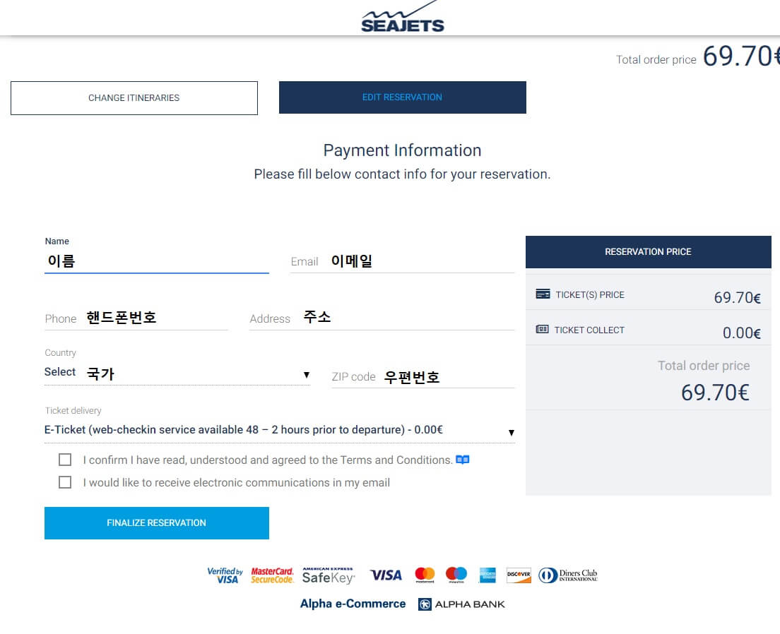마지막으로 개인정보를 입력하신 후 결제 진행하시면 되겠습니다. 우편번호 아래에 Ticket delivery부분에는 E-Ticket으로 설정하셔서 E-ticket으로 확인 후 탑승하시면 되겠습니다.