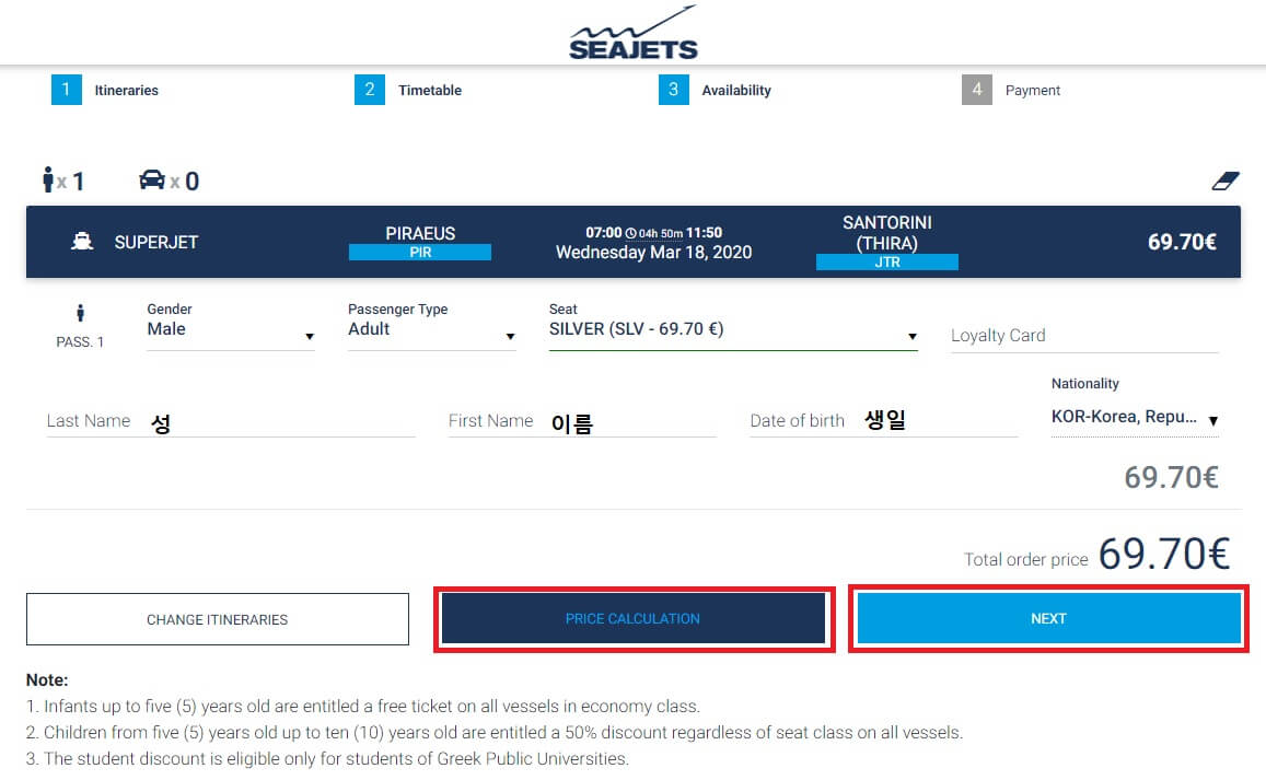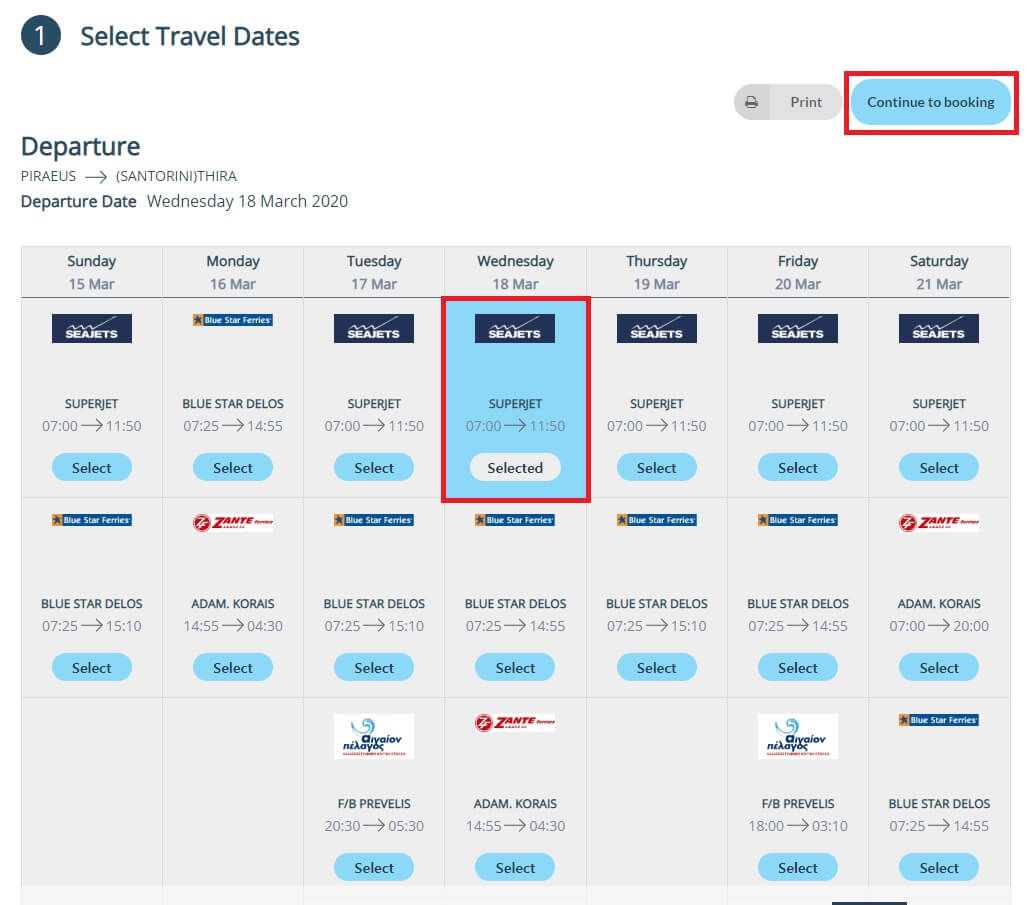 다음 화면으로 넘어가시면 배의 상세 운항정보를 볼 수 있습니다. 아마 피레우스 항에서 산토리니 티라로 가는 직항은 없는 것 같고 미코노스 넘이나 티노스 섬을 거쳐 산토리니로 가게 되는데, 티노스 섬이나 미코노스 섬을 가실 분들도 이 방법 그대로 예약하시면 될 것 같습니다.