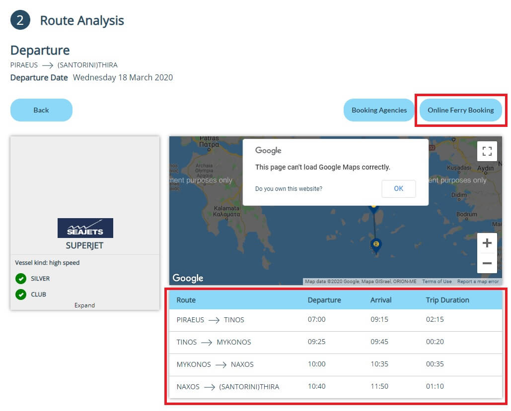 다음 화면으로 넘어가시면 배의 상세 운항정보를 볼 수 있습니다. 아마 피레우스 항에서 산토리니 티라로 가는 직항은 없는 것 같고 미코노스 넘이나 티노스 섬을 거쳐 산토리니로 가게 되는데, 티노스 섬이나 미코노스 섬을 가실 분들도 이 방법 그대로 예약하시면 될 것 같습니다.